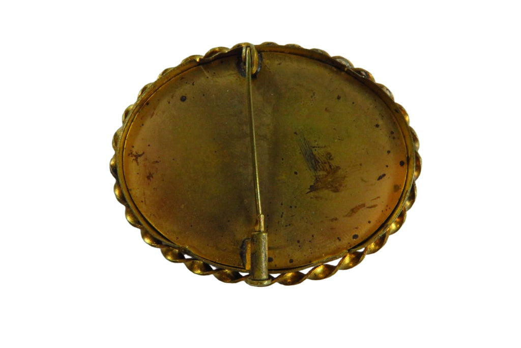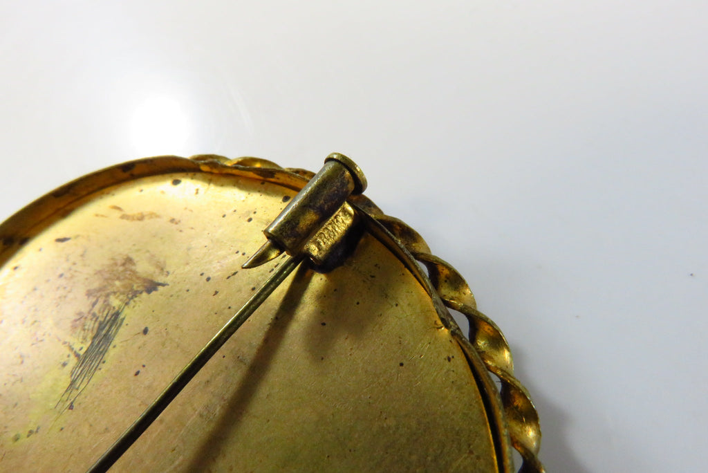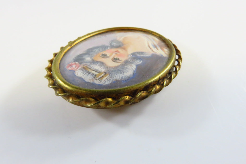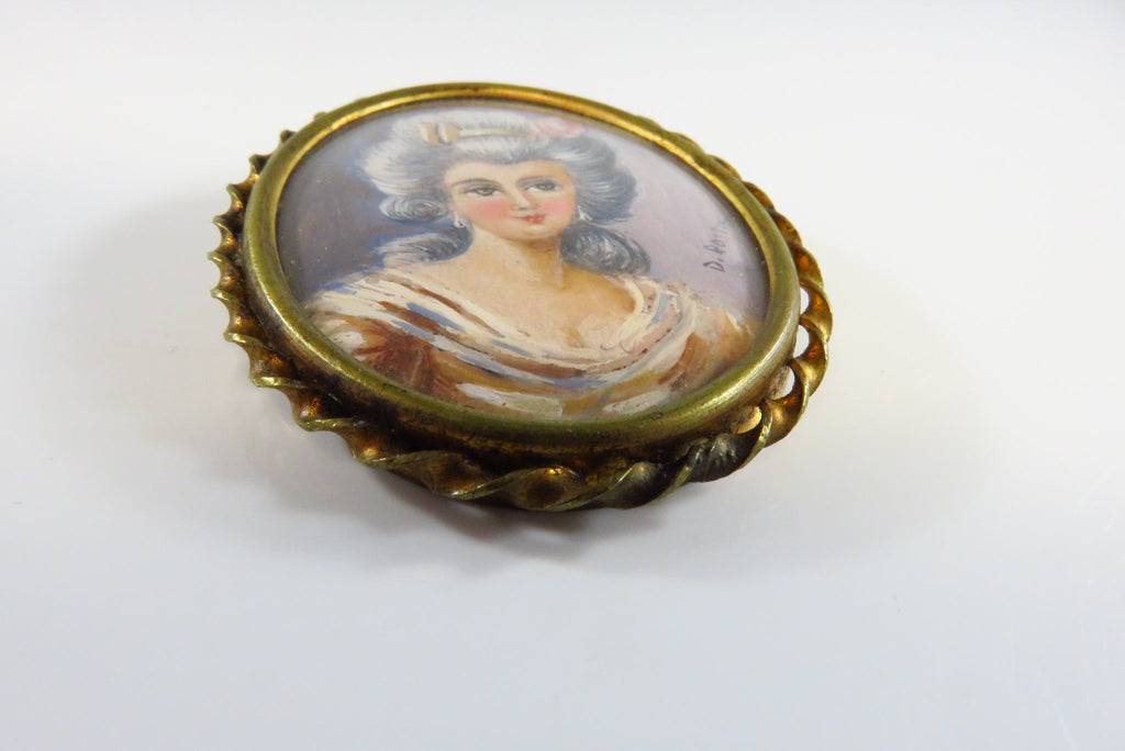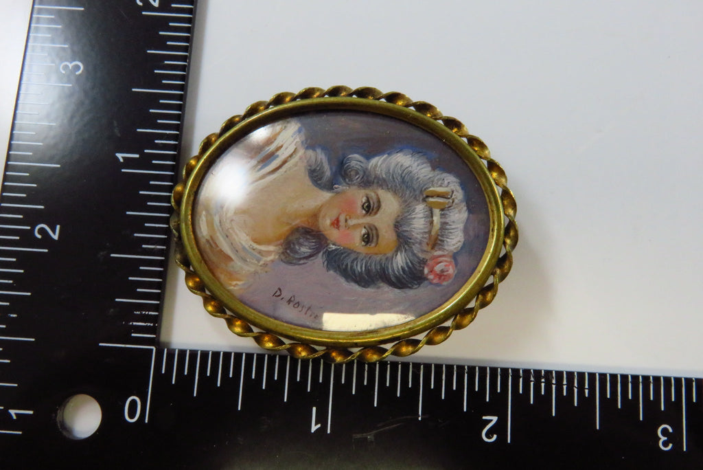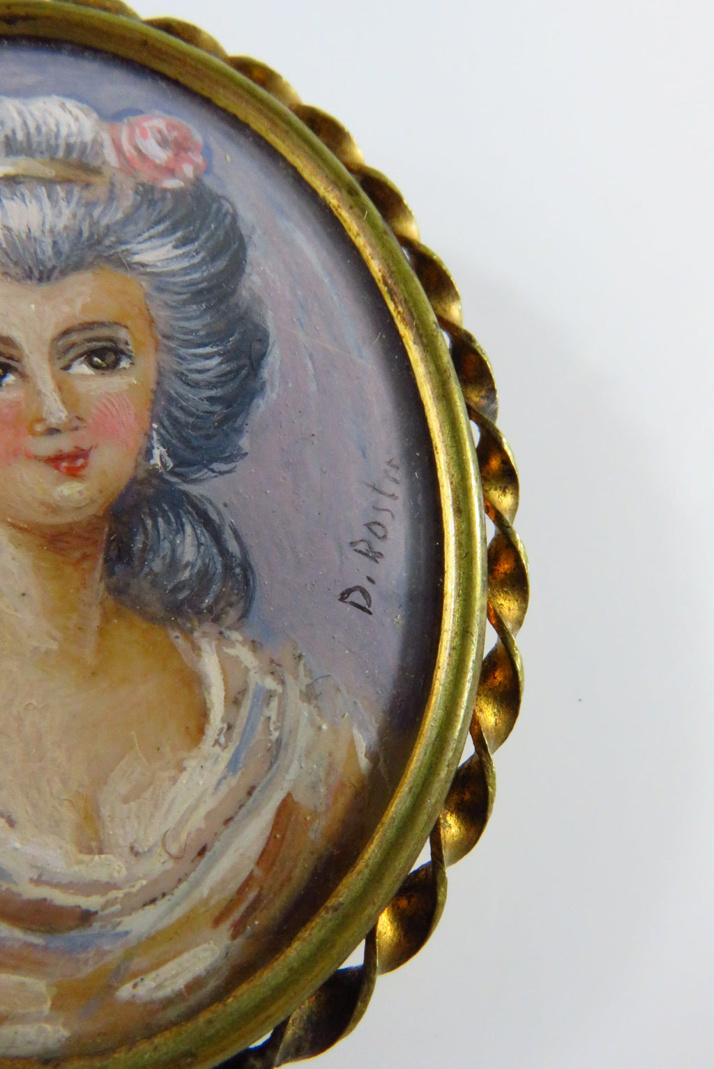 French Portrait Miniature Brooch Under Glass Signed D. Rostir Gilded Brass