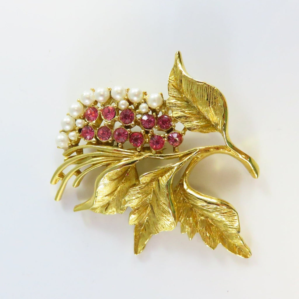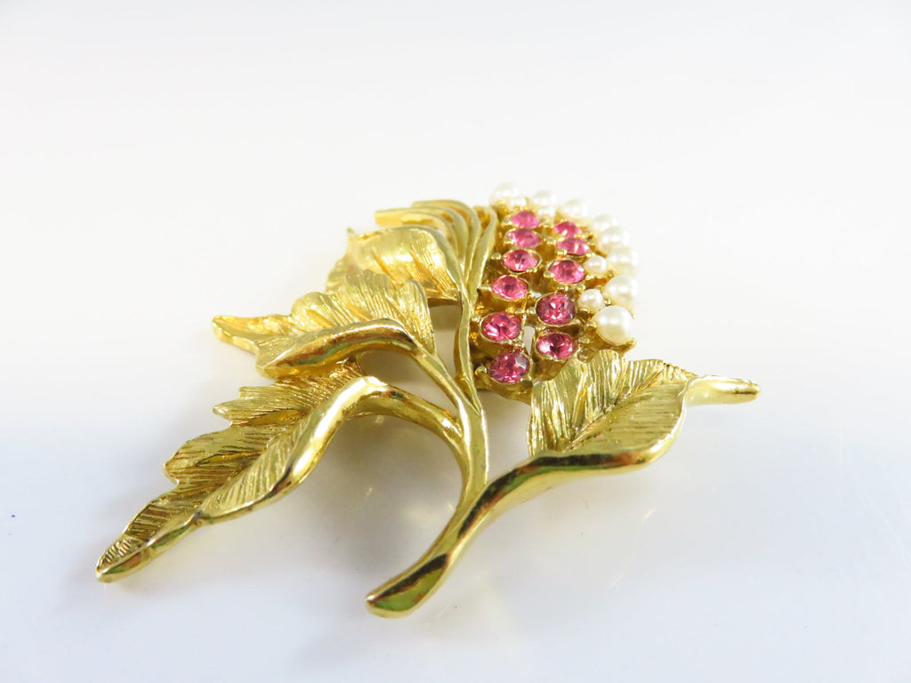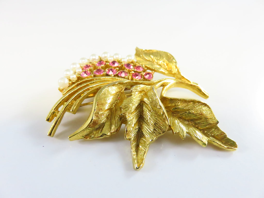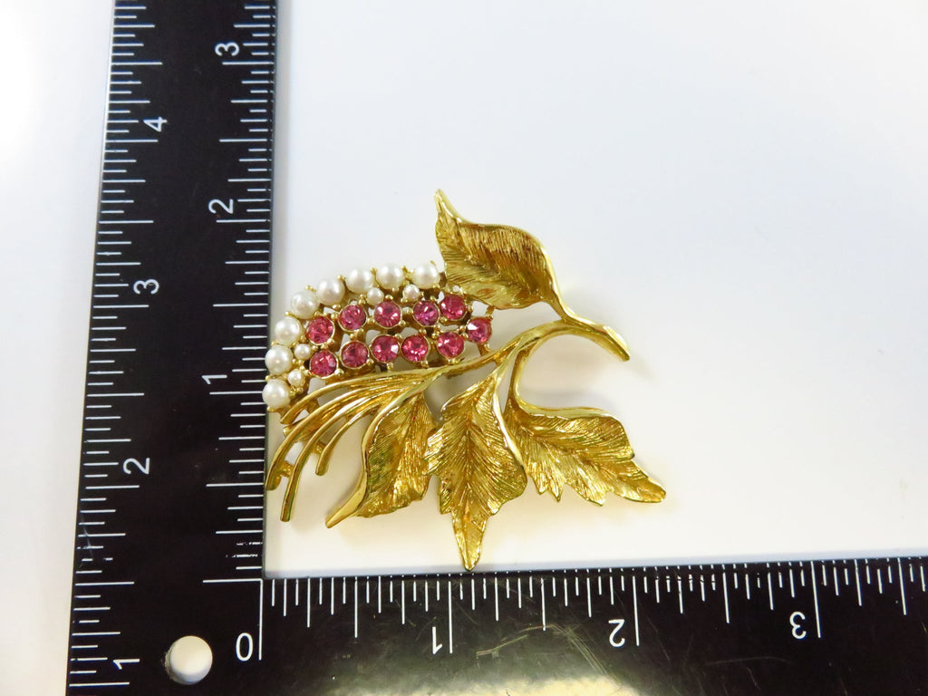 Gerry's Pink Rhinestone Faux Pearl Leaf Brooch in Gold Tone Setting