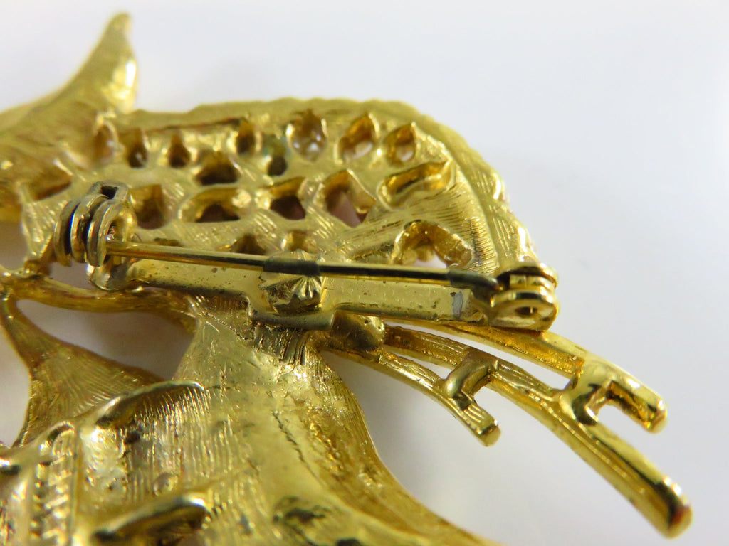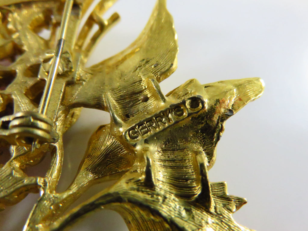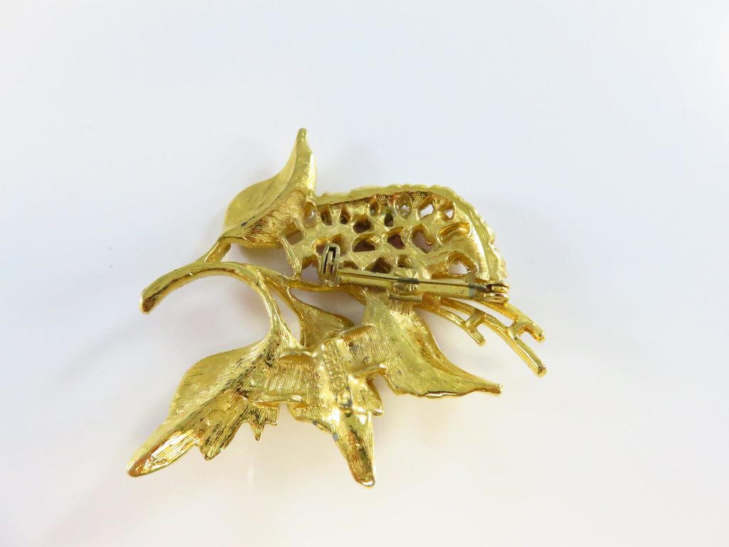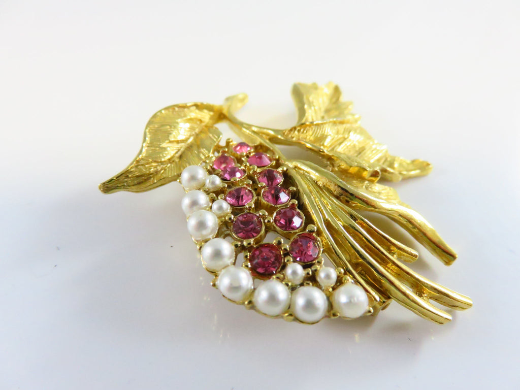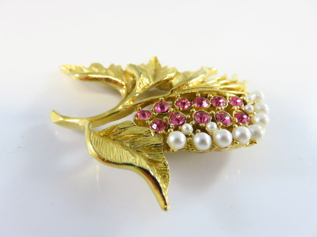Gerry's Pink Rhinestone Faux Pearl Leaf Brooch in Gold Tone Setting