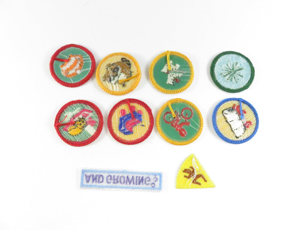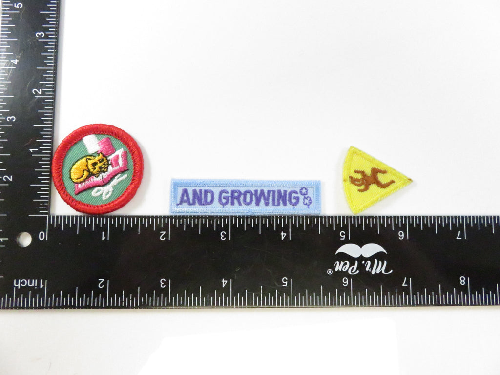 Girl Scout Fun Patch Collection – 8 Rounds, 1 Tab (“And Growing”), 1 Triangle – Unused Vintage