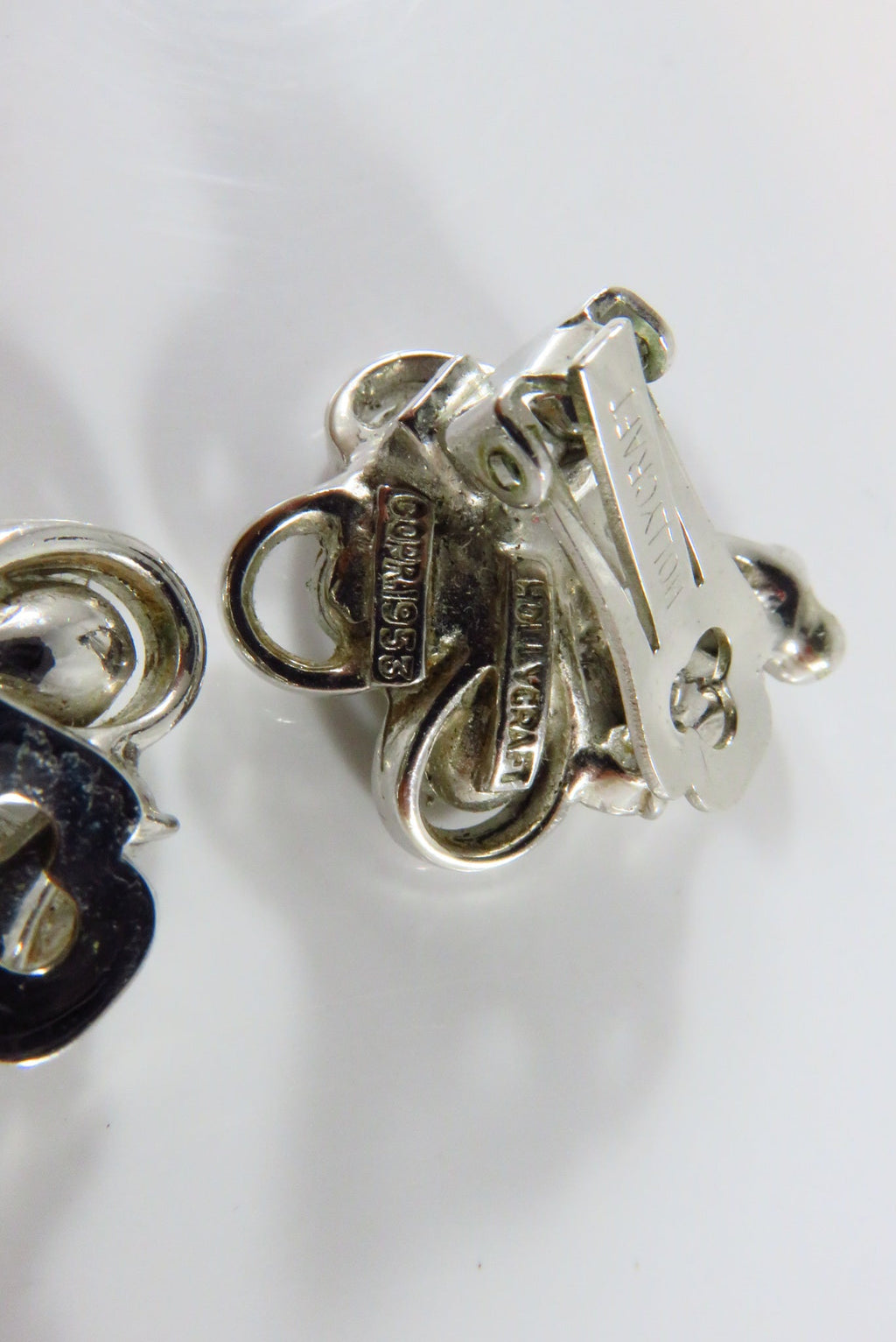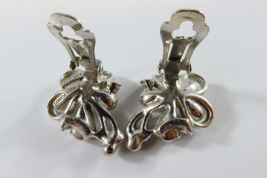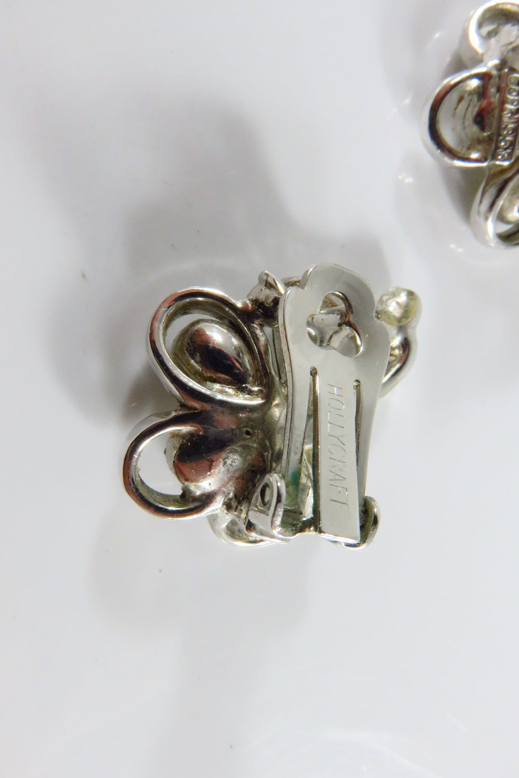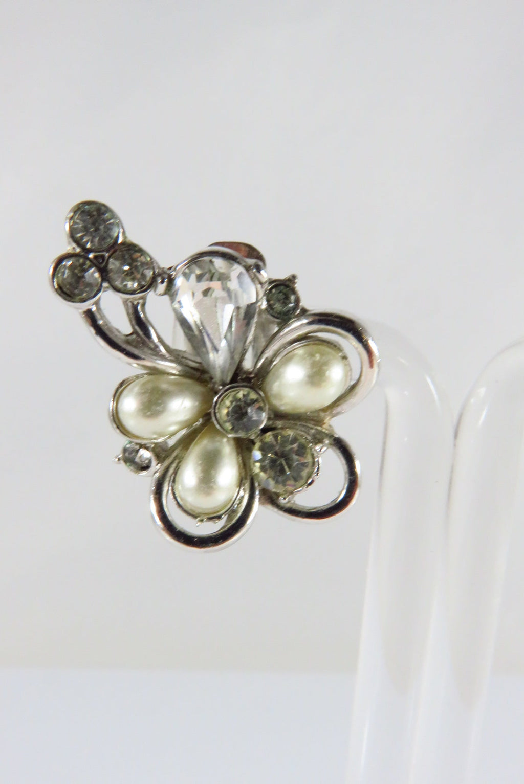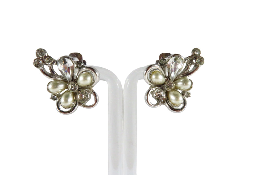 c1953 Hollycraft Clip On Flower Earrings Rhinestones Faux Pearl Earrings