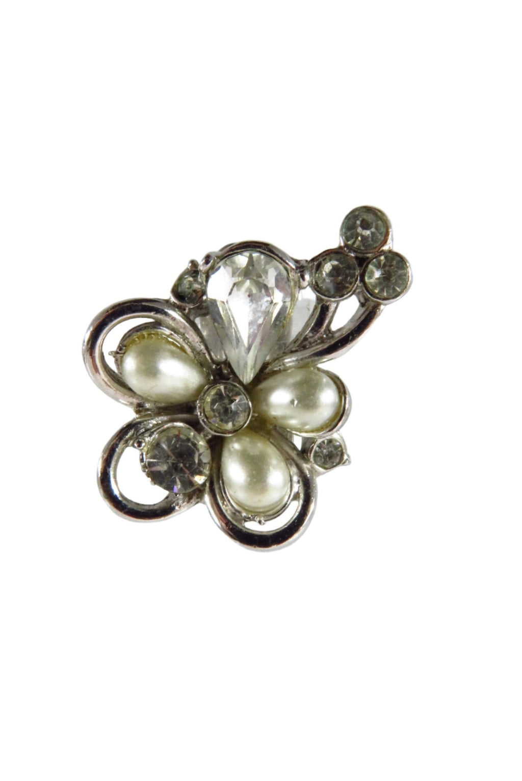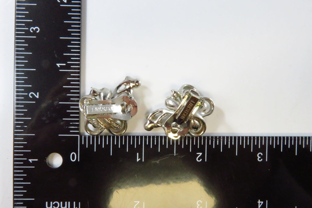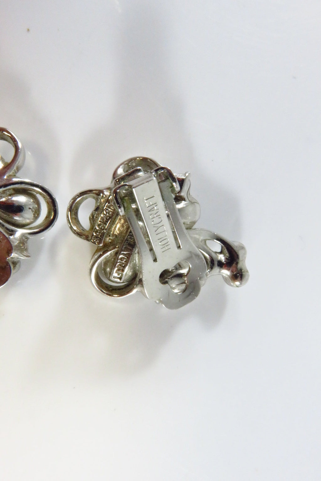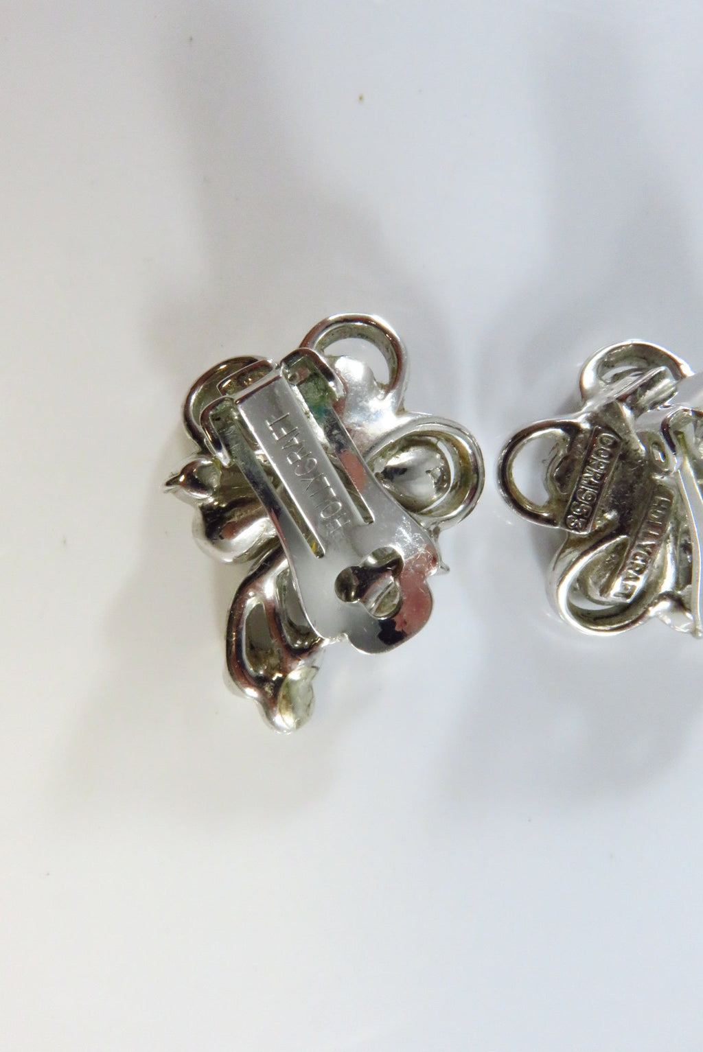 c1953 Hollycraft Clip On Flower Earrings Rhinestones Faux Pearl Earrings