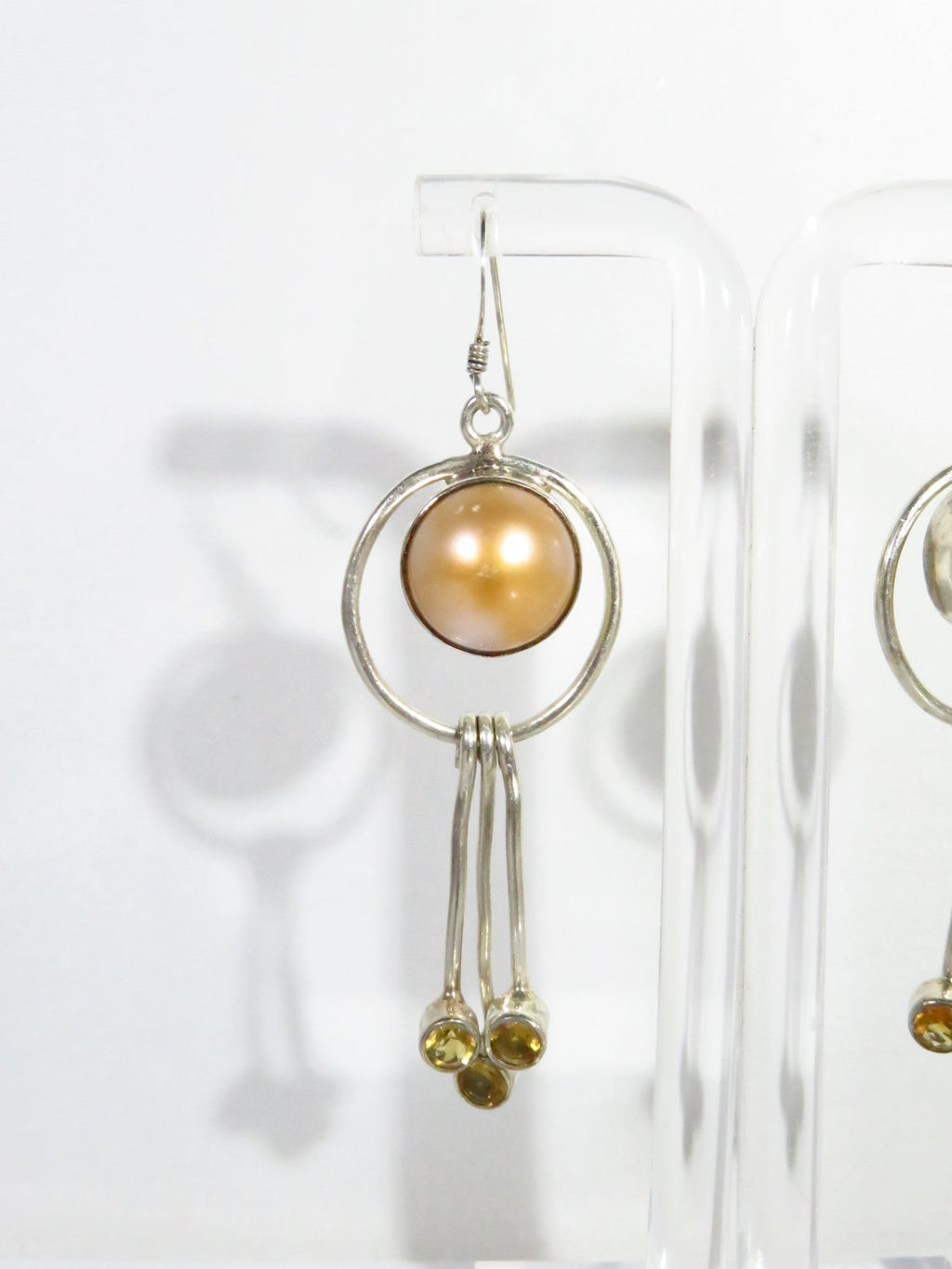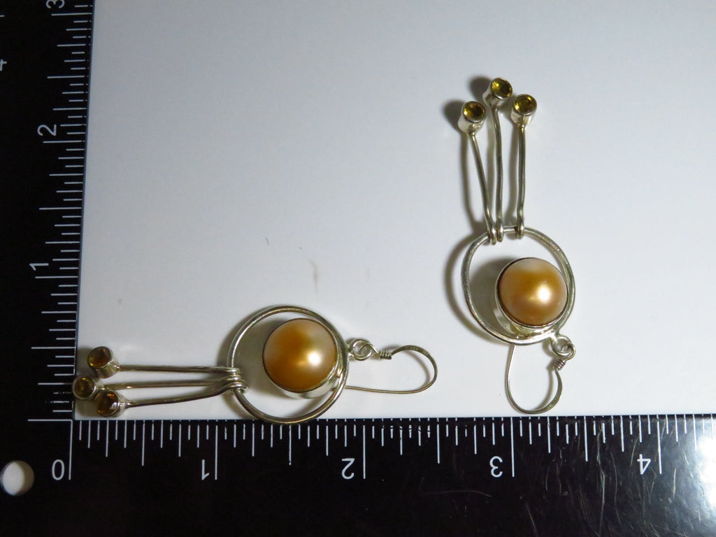 Modernist Pearl Dangling Earring Set Colored Glass Stones Sterling Silver
