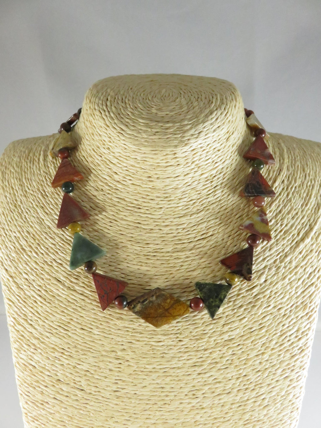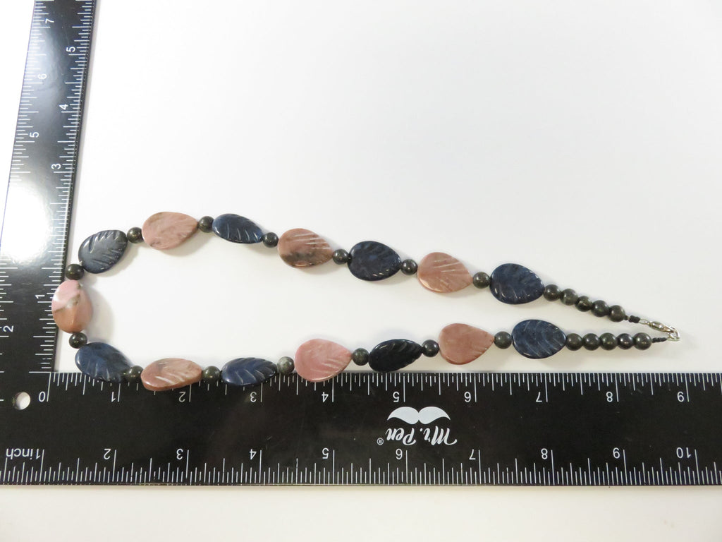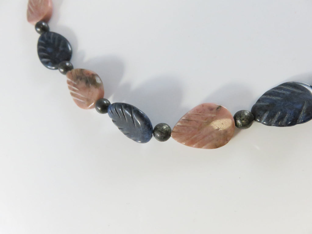 Pink Blue Polished Stone Necklace, Leaf & Ball Beads, Abstract Center Stone, Wire Threaded, 19"