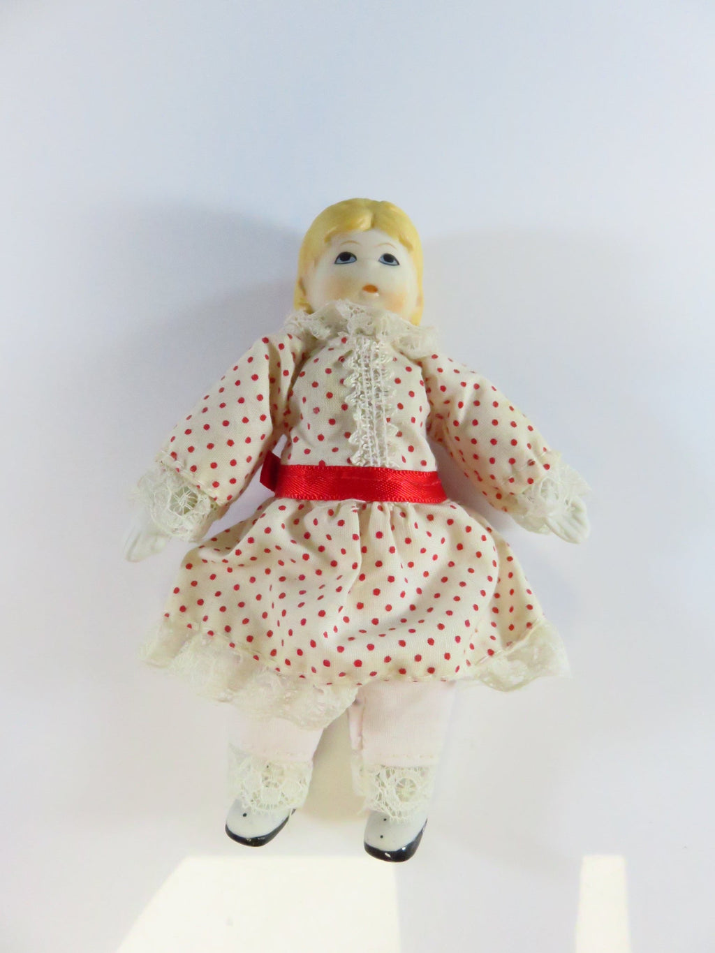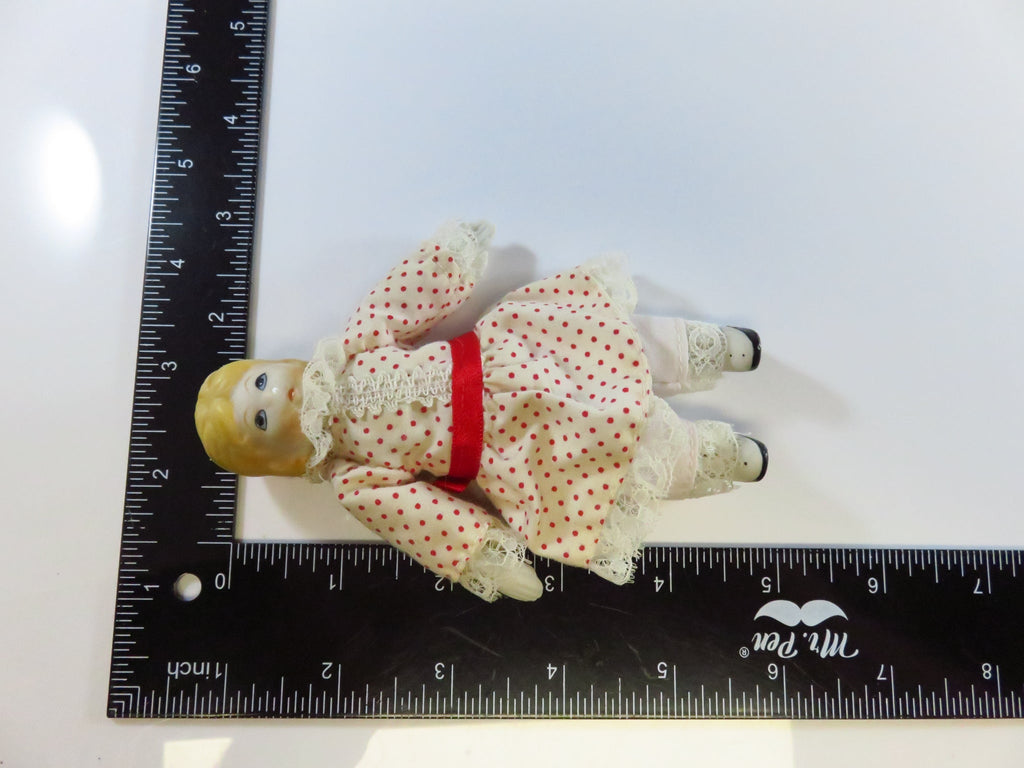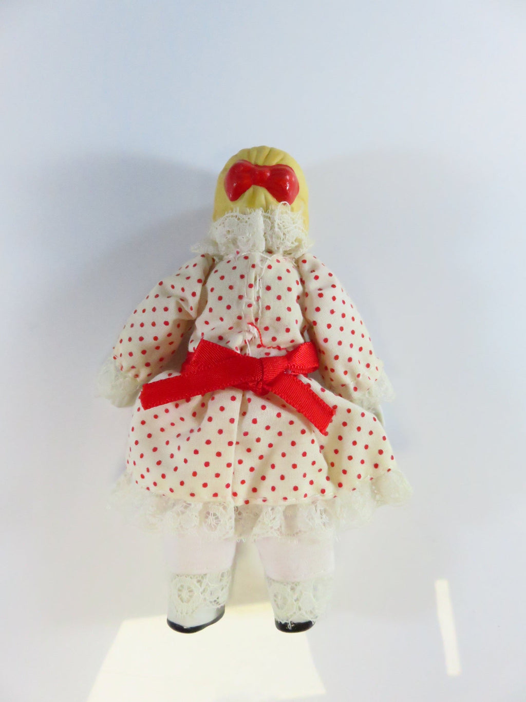 Vintage 1970's Russ Berrie? Miniature Girl Doll In Red Polka Dot White Dress