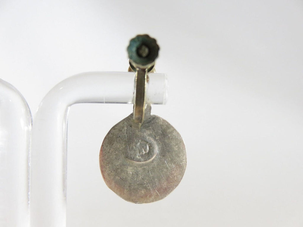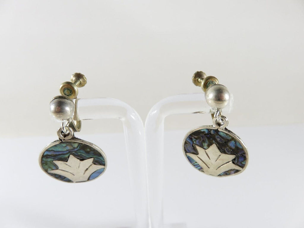 Figural Palm Leaf Disc Abalone & Sterling Taxco Mexico VKE Silver Screw Back Earrings