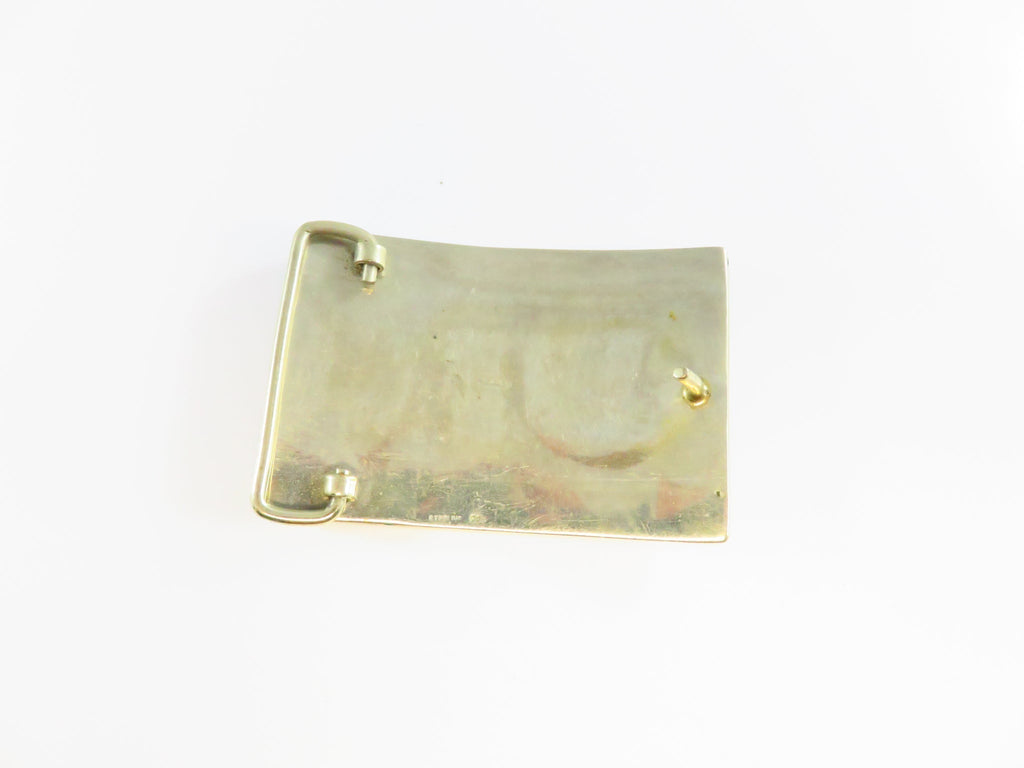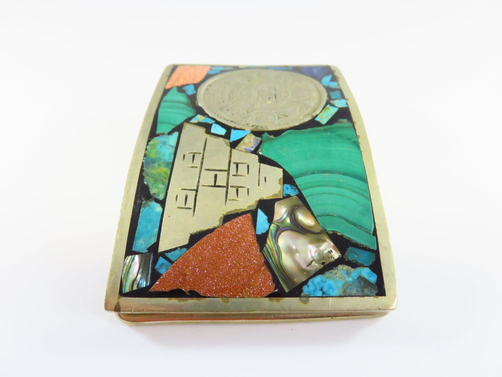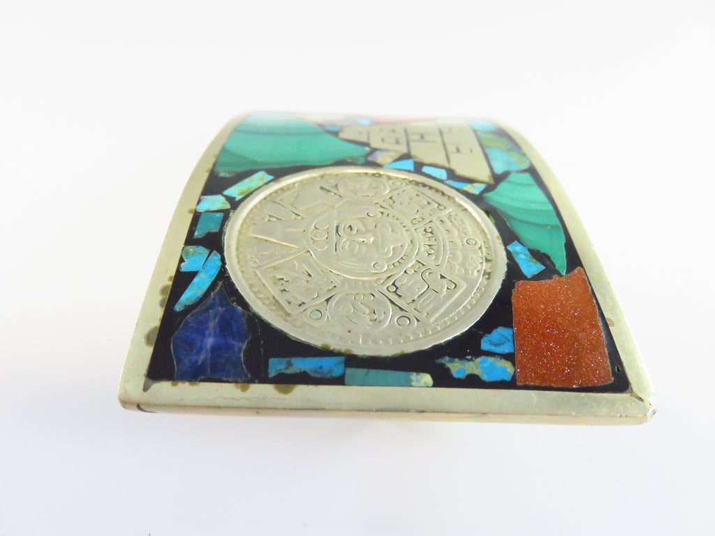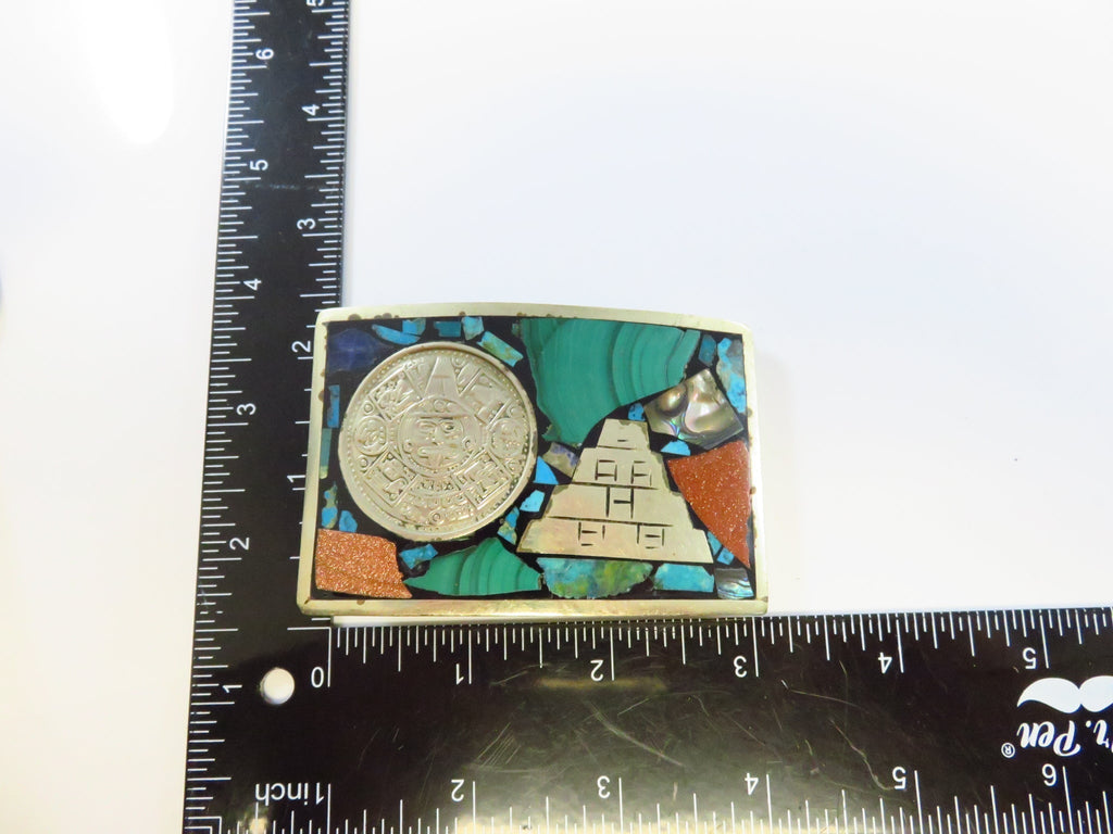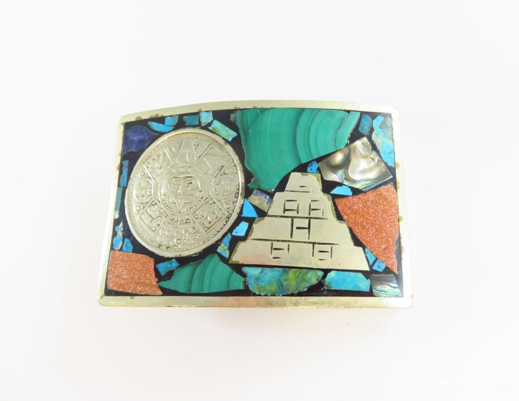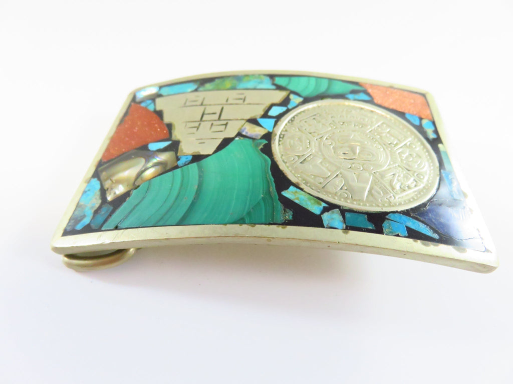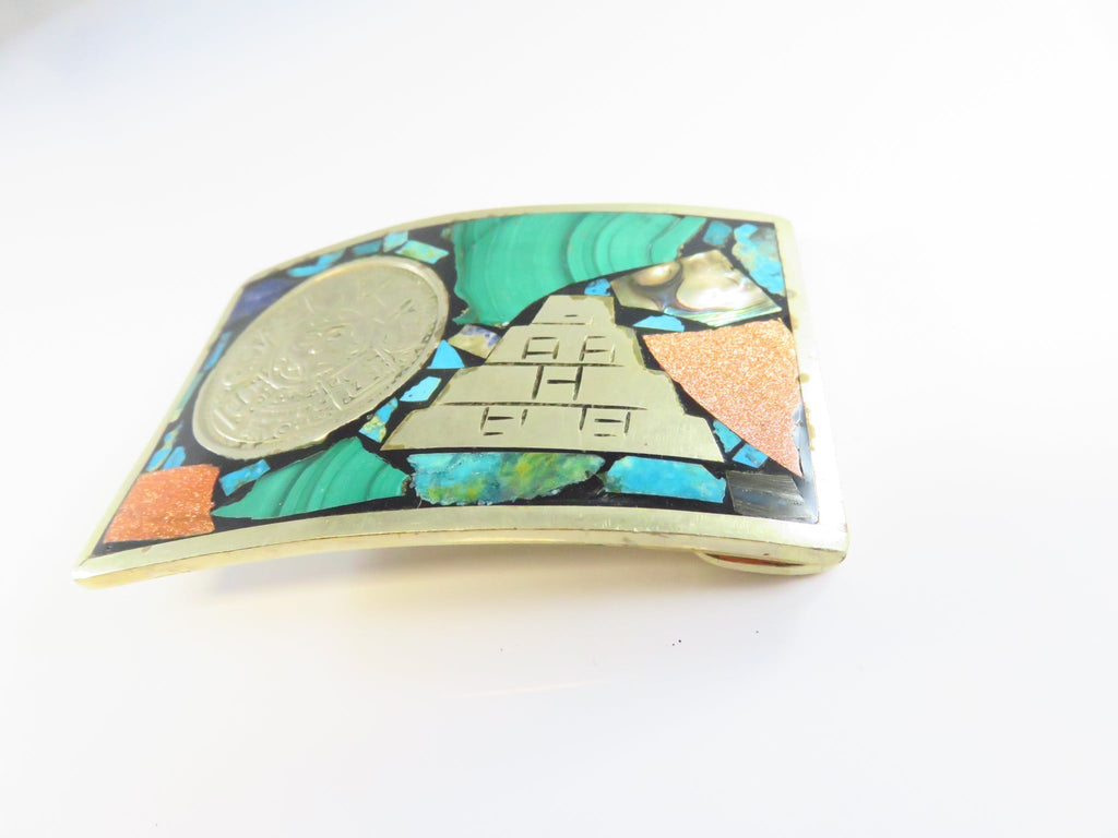 Vintage Rectangular Aztec Calendar Pyramid Belt Buckle Mixed Stones 1 7/8" Belt