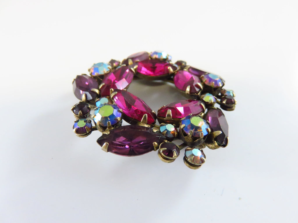 Weiss Purple Pink Glass and Aurora Borealis Wreath Brooch 2" x 2"