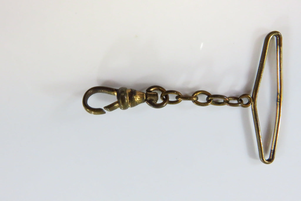 Vintage small pocket watch pendant blow clip hook with bar for a ribbon style pocket watch chatelain. Measure about 34.36mm across and about 1 1/2" drop including the clip. No markings on this item. Brassing prevalent.