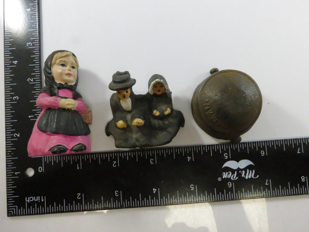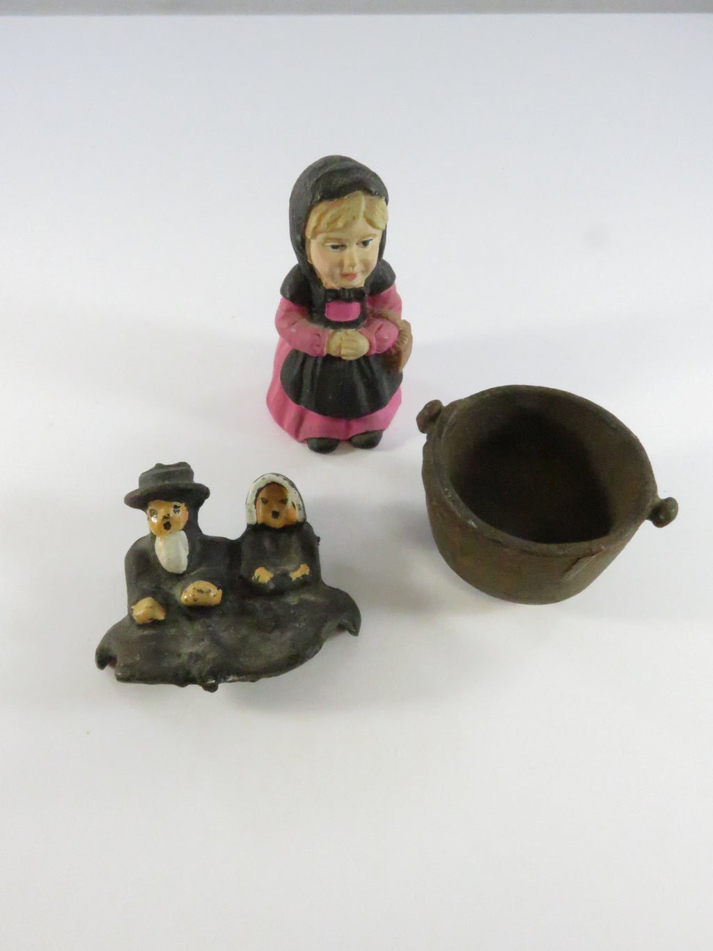 Antique Cast Iron & Vintage Figurine Parts Lot – Caldron, Amish Couple, ARTCO Woman Figure