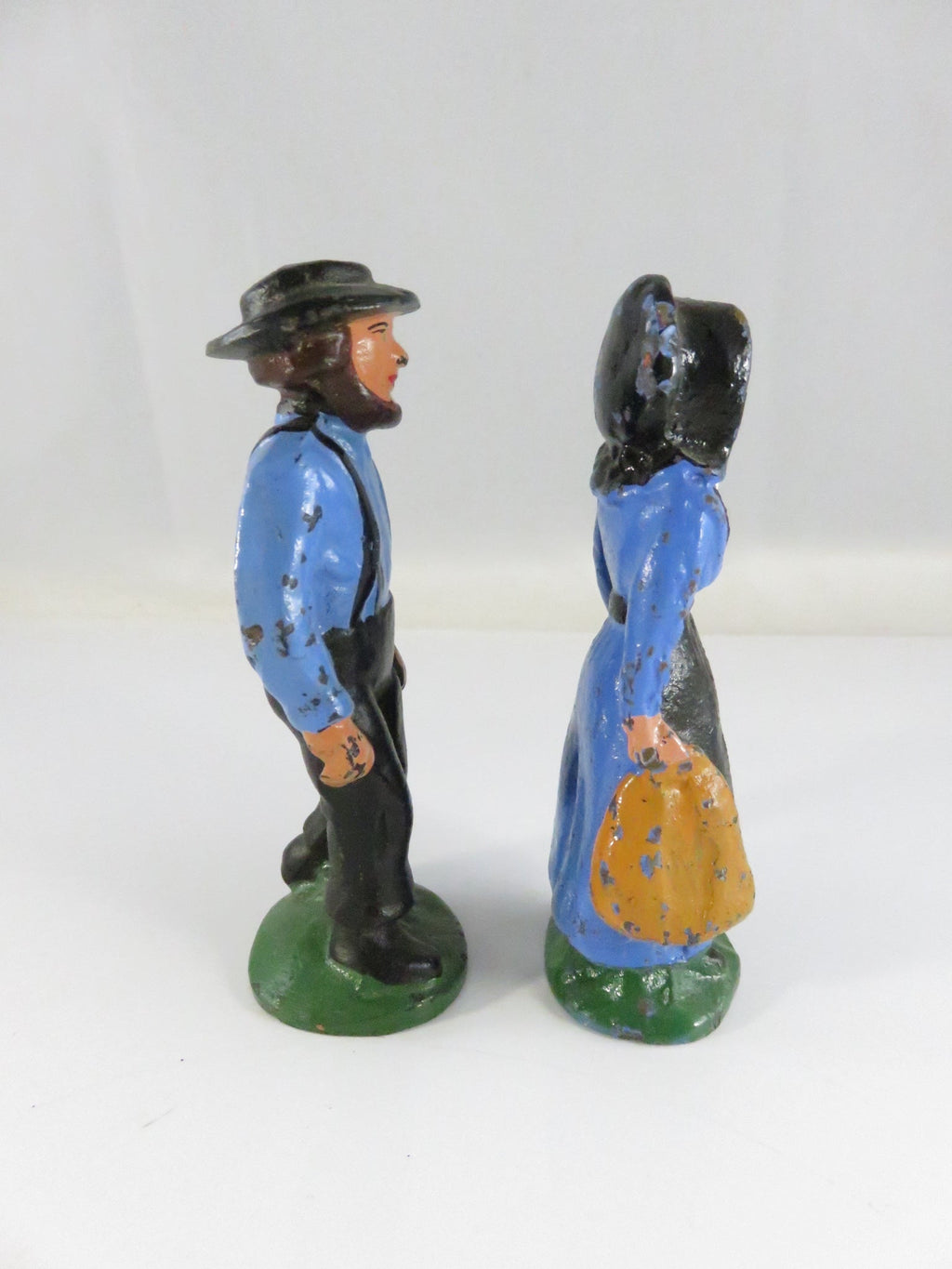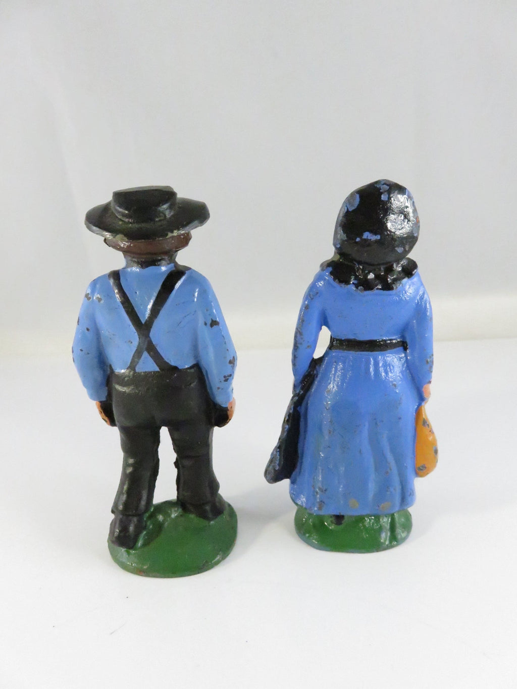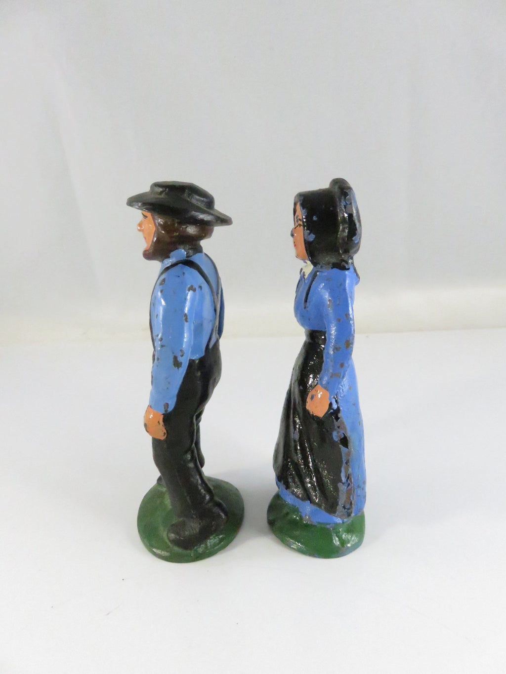 Vintage Cast Iron Amish Couple Figurines Hand-Painted Blue & Black approx. 4 1/4"