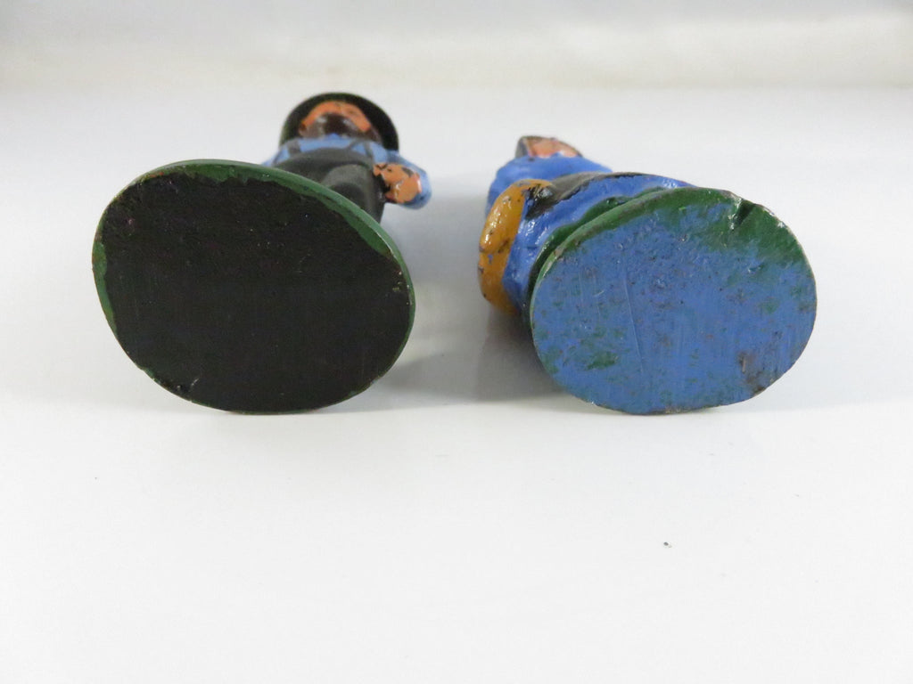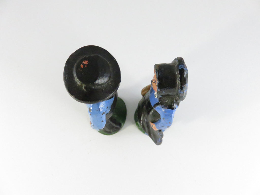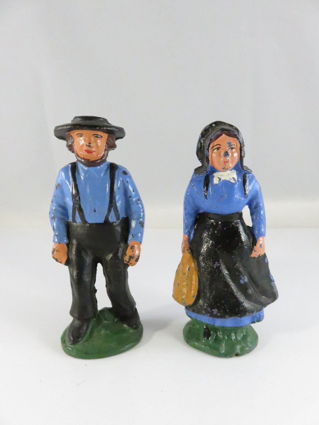 Vintage Cast Iron Amish Couple Figurines Hand-Painted Blue & Black approx. 4 1/4"