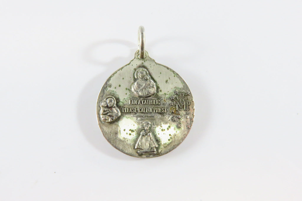 Pre-owned "I Am A Catholic Please Call a Priest" large round sterling silver Pendant. This round 4 way medal is made by Creed.
