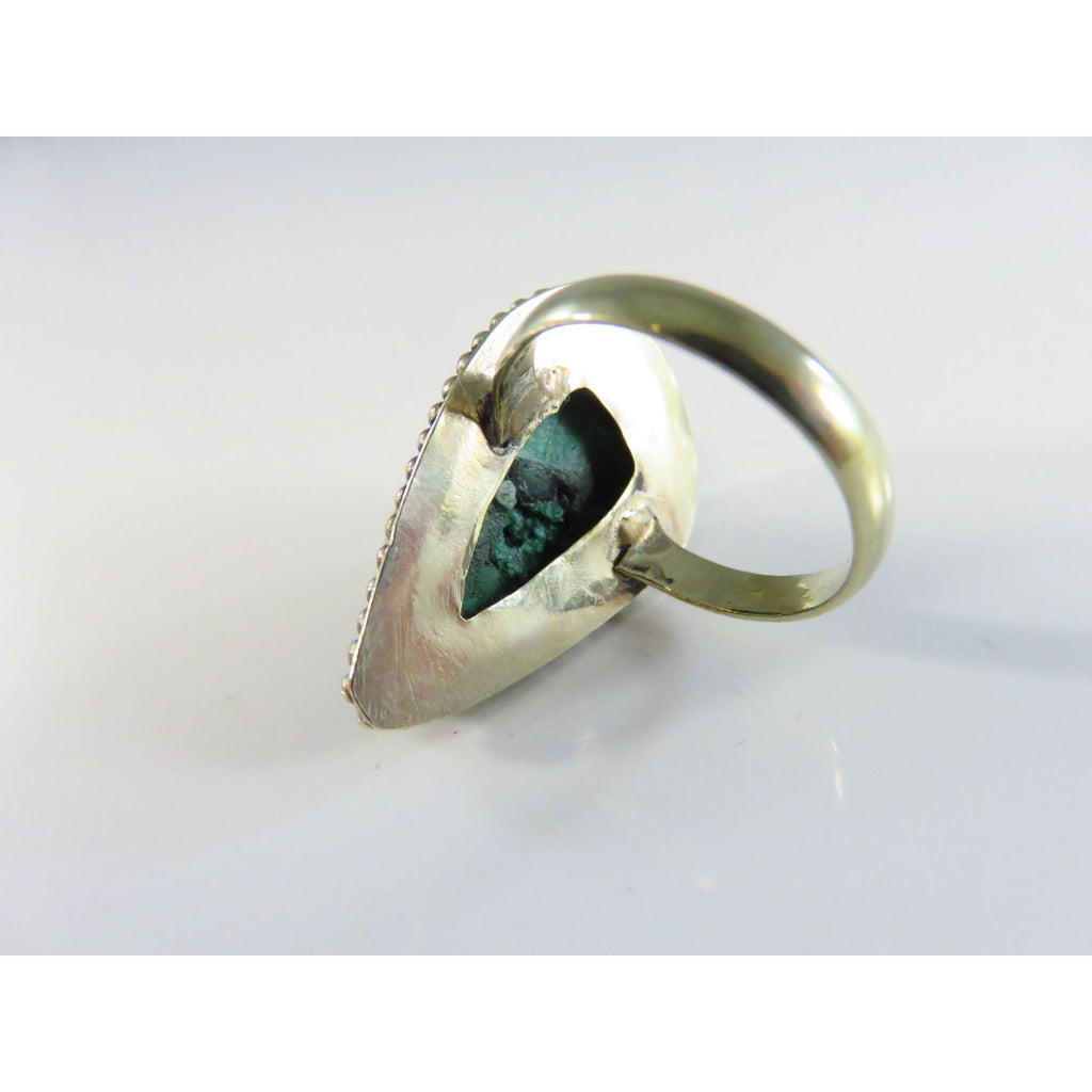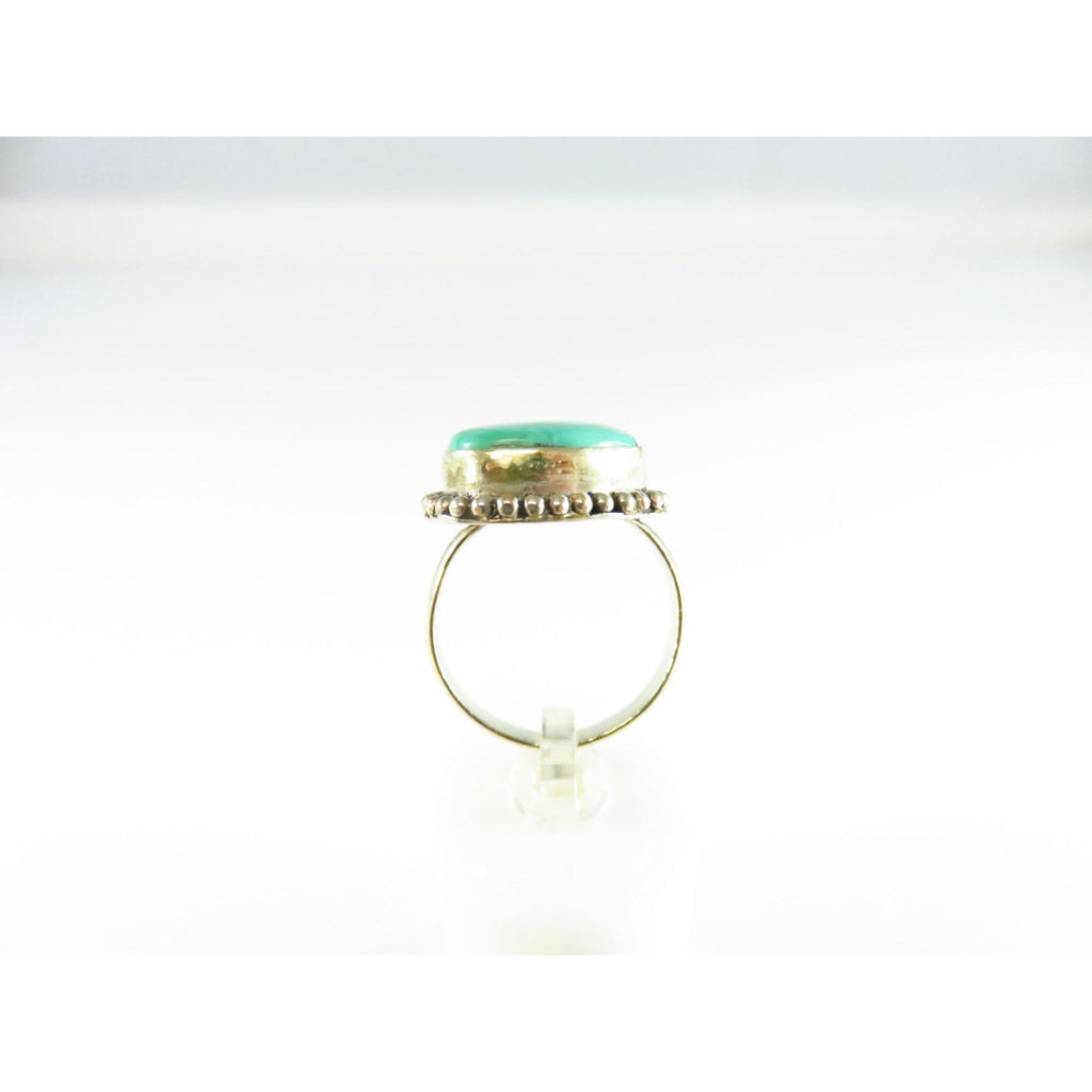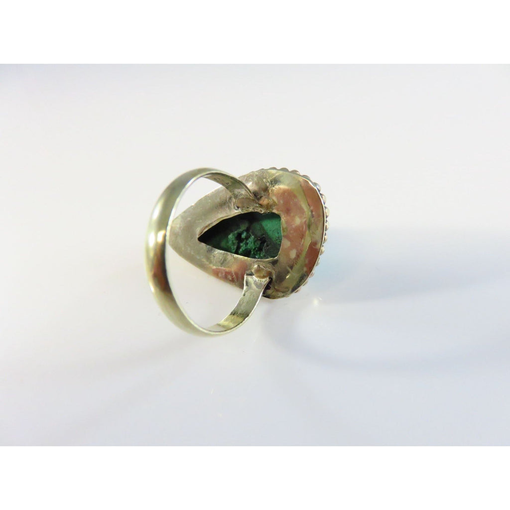 Sterling Silver Ring With Polished Malachite Stone & Beaded Ball Surround