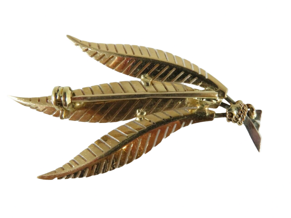 18K Yellow Gold Fern Leaf Brooch with Platinum-Toned Stems Marked 750
