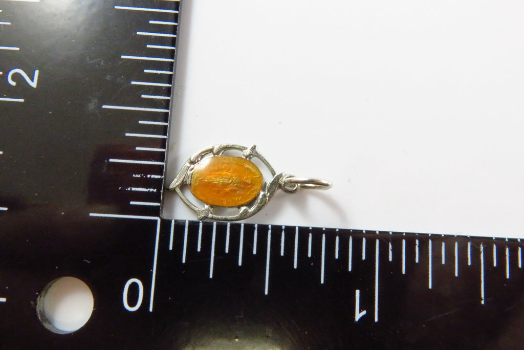 A pre-owned Virgin Mary miracle medal in sterling silver with an orange enamel overlay in fair condition. This oval miraculous medallion of the blessed Virgin Mary features a pierced outline a nd is designed to be worn as a charm or added to a rosary.