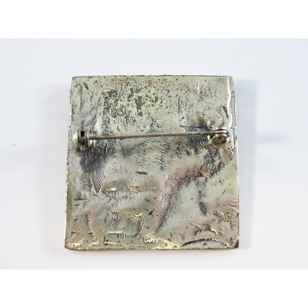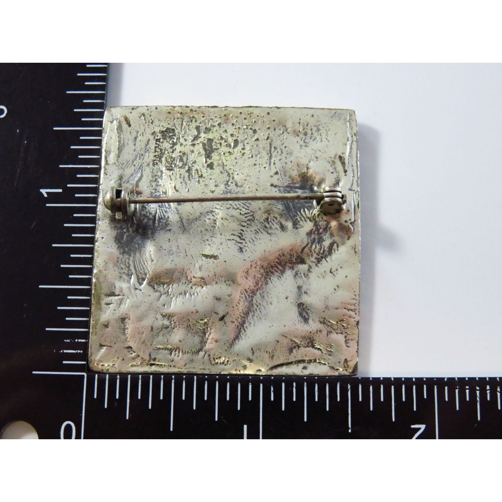 An intriguing reproduction square brooch featuring an angel and blacksmith scene. Measures 1 5/8 inches in height. Pitting to the back, silver plate loss on back, front is soiled with losses
