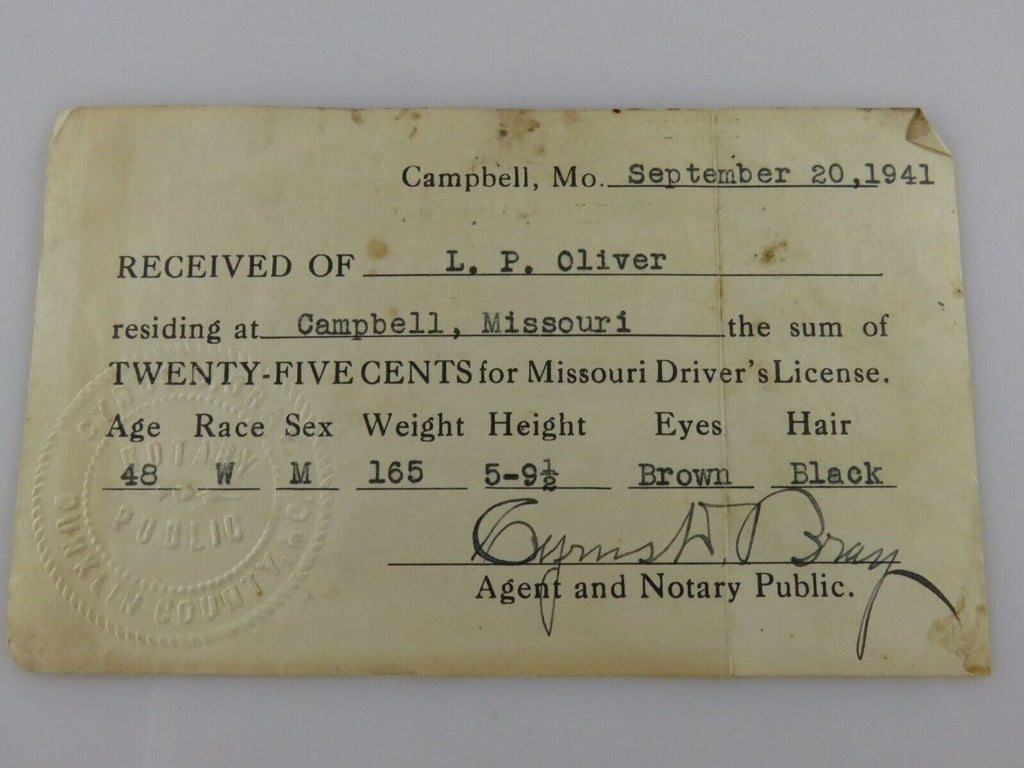 Sept 20 1941 State of Missouri Driver's License for L.P. Oliver Campbell MO