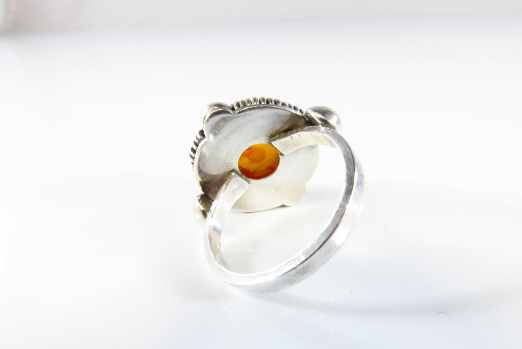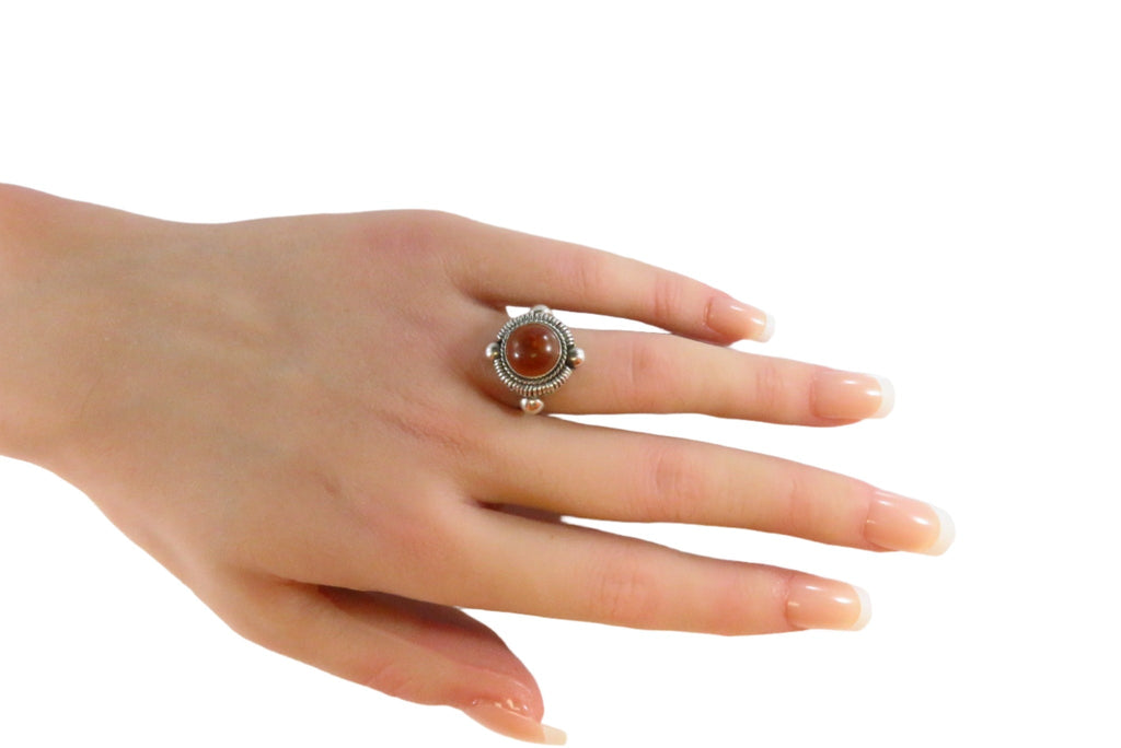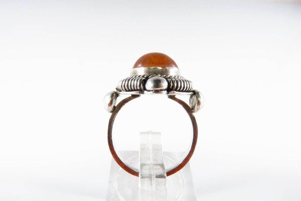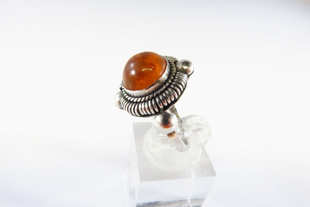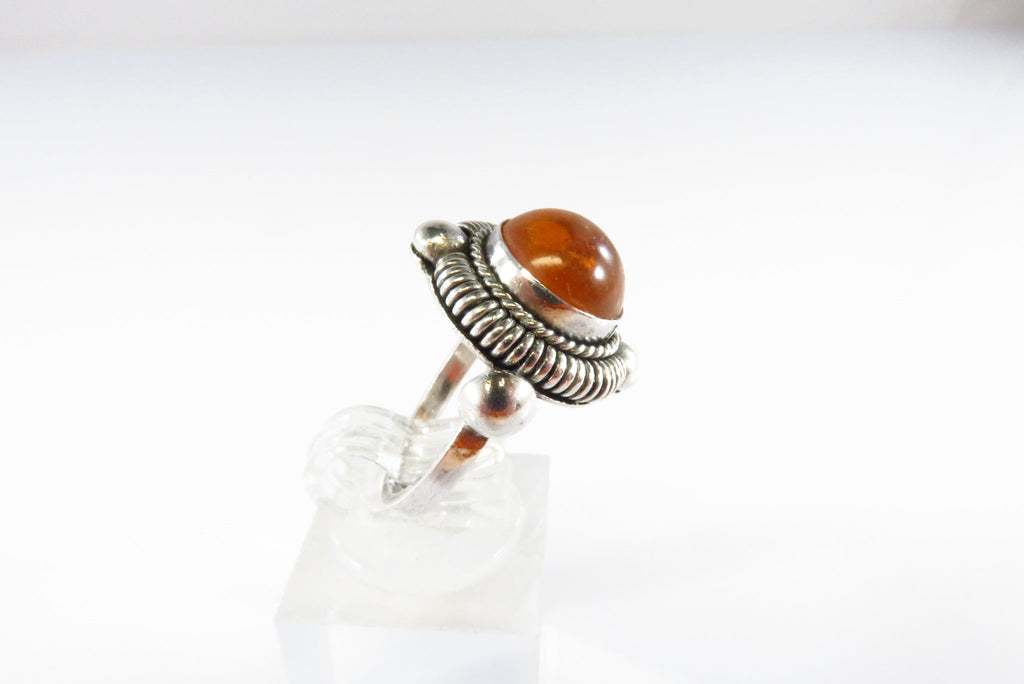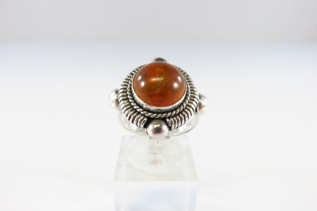 Vintage Amber Ring Round Bezel Set Twisted Wire and Ball Accented Design Sz 5.5